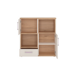 2 door 1 drawer cupboard with 2 open shelves in light oak and white high gloss with coloured handles. This neutral and functional kids collection is perfect for all age groups, finished in light oak and stunning white high gloss. Clever design with 2 doors and I drawer this unit has 2 open shelf display areas.