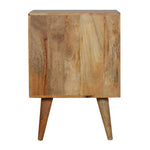 This bedside offers a contemporary and versatile style of furniture for today's modern interiors. It has been constructed from 100% solid mango wood in an oak-ish finish and finished with a clear lacquer making the product durable and able to withstand years of use. It has an assorted pattern on the drawer fronts using different bits of wood and 2 candle knobs. The perfect buddy for your bed.