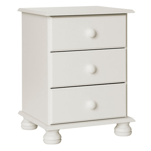 Copenhagen 3 Drawer Bedside in attractive off white MDF is an elegantly designed storage solution. It will comfortably hold a lamp, alarm clock and your favourite book or kindle on top and there is ample storage in the 3 drawers. All drawers are on easy glide runners with cam lok system on fronts. Modern design in solid white MDF finished with a smooth lacquer, makes this an attractive choice for any bedroom.