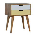 This bedside table is the perfect stand for any bits and pieces you wish to keep nearby before bedtime. It features ample space for a lamp, photo frame, or any ornaments. It has been constructed from 100% solid mango wood with a fine oak-ish finish body with hand painted cut-out drawers in yellow and white. Some other product characteristics are 4 Nordic style legs with cut-out slots for easy access to and from the drawers. A lovely pop of colour and addition to the home.