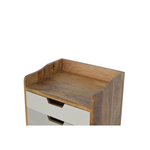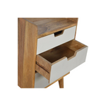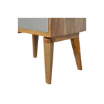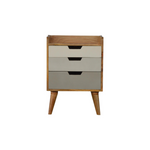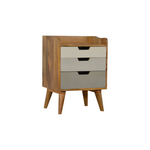 This bedside table makes a perfect stand for nibbles, drinks or a lamp. It has been constructed from 100% solid mango wood with a fine oak-ish finish body. It also features 3 grey gradient, hand-painted cut-out drawers and 4 Nordic style legs. A lovely addition to the home.