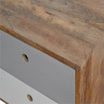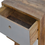 This Nordic style bedside table is constructed from 100% solid mango wood in an oak-ish finish and features 2 drawers hand painted in two tons of grey with 2 cut out open slots for easy access into the drawers. It can be used to store any bits and pieces before bedtime and can be incorporated with many interior styles for both modern, city homes and apartments. It is a versatile product which can stand alone or be paired with the other pieces from the range.