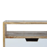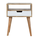 This solid wood Nordic style bedside is a fabulous addition to your home adding a more modern feel your bedroom with its design. It has been constructed from 100% solid mango wood in an oak-ish finish. It comes with 1 cut out drawer that has been hand painted white and 1 open slot. Other features include 4 knock down Nordic style legs.