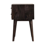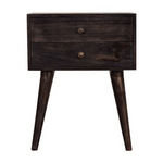 Endlessly versatile, this bedside table makes a perfect stand for nibbles, drinks, or a lamp and will prove handy all over your home. It is made from 100% solid mango wood in an ash black finish and features 2 drawers. Other features include shiny knobs on the drawers and 4 Nordic-style legs.