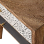 This bedside table is the perfect stand for any bits and pieces you wish to keep nearby before bedtime. It features ample space for a lamp, photo frame, or any ornaments. It has been constructed from 100% solid mango wood with a fine oak-ish finish body with one black and one patterned drawer. A lovely pop of colour and addition to the home.