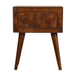 Endlessly versatile, this bedside table makes a perfect stand for nibbles, drinks, or a lamp and will prove handy all over your home. It is made from 100% solid mango wood in a chestnut finish and features 2 drawers. Other features include shiny knobs on the drawers and 4 Nordic-style legs.