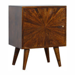 Showcasing the sunrise patterned door, this bedside table has been constructed from 100% solid mango wood in a chestnut finish and small shiny knobs. Offering a modern retro aesthetic, this bedside is a timeless option for your bedroom.