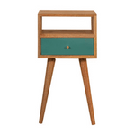 This beautifully designed bedside is constructed from 100% solid mango wood and has a fine oak-ish finish. Useful storage space is available with a 1 teal hand-painted drawer, 1 shelf, and a decent-sized tabletop to place any ornaments. Other features include 4 Nordic style legs to give the piece a modern style that will suit most homes.