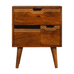 This mini handy bedside has been constructed from 100% solid wood in a chestnut finish. It features 1 drawer and 2 mini removable drawers with a simple brass inlay design, perfect for storing any bits and pieces. The perfect addition for the bedroom as well as the living room.