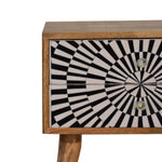 This bedside has been constructed from 100% solid mango wood and finished in a fine oak-ish finish body. The 2 drawers feature a resin patterned inlay which is bound to uplift your bedroom and allow you to store any bits and pieces discreetly. It also has 4 Nordic-style legs and ample space on top for a lamp, photo frames, or ornaments.