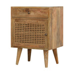 Enjoy this minimalistic oak-ish finish bedside constructed from 100% solid mango wood. It features 4 tapered handcrafted legs and a unique rattan door front to take care of everyday utility items. This bedside will add a nice touch and lasting character to your bedroom and home.