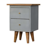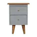 This bedside table has been constructed from 100% solid mango wood and finished with a oak-ish finish top and Nordic style legs. The body of the bedside has been finished in a hand painted sky blue paint and features shiny knobs on the 2 drawers for easy access. This bedside is bound to spice up your bedroom.