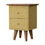 This bedside table has been constructed from 100% solid mango wood and finished with an oak-ish finish top and Nordic style legs. The body of the bedside has been finished in a hand painted yellow paint and features shiny knobs on the 2 drawers for easy access. This bedside is bound to spice up your bedroom.