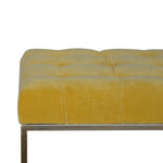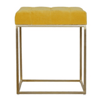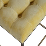 This luxurious footstool can be added to any part of the home, upholstered in a luxurious mustard yellow velvet cotton velvet, featuring a lovely deep button design throughout giving the piece class and allows it to fit into any type of interior as an accent piece. The base has been constructed from a golden brass base with a padded design for definition.
