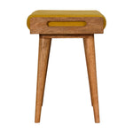 This footstool features a tray-style design and 4 Nordic-style legs constructed from 100% solid mango wood. It is upholstered in a mustard yellow cotton velvet top, which works as a comfortable seat and can be incorporated into many different interior styles as it offers a very clean and modern design, along with providing a nice contrast between the material and wood.