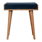 This footstool features a tray-style design and 4 Nordic-style legs constructed from 100% solid mango wood. It has been upholstered in teal cotton velvet, which works as a comfortable seat and can be incorporated into many different interior styles as it offers a very clean and modern design, along with providing a nice contrast between the material and wood.