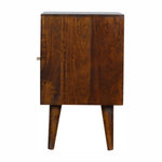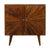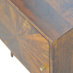 This cabinet has been designed to provide convenient storage space for your home. It has been constructed from 100% solid mango wood in a chestnut finish with a sunrise pattern followed by shiny candle knobs. Offering a modern retro aesthetic, this cabinet is both a handy and timeless option for your home.
