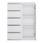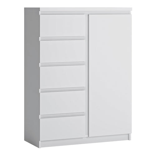 A high chest of drawers with drawers takes up little space, yet it is roomy - an ideal piece of furniture for small interiors. There are five drawers and three hidden spaces behind the front. The white chest of drawers has been equipped with practical furniture accessories in the form of drawers with full extension , as well as a handle-free system that is convenient to use. The chest of drawers from the Fribo collection deserves recognition for its simple form and functionality, the white of the decor can be the basis for numerous Colour arrangements. The furniture is made of laminated chipboard, resistant to moisture, scratches, damage and high temperature. The program is available in two Colour versions: Alpine White and Golden Ribbeck Oak.