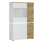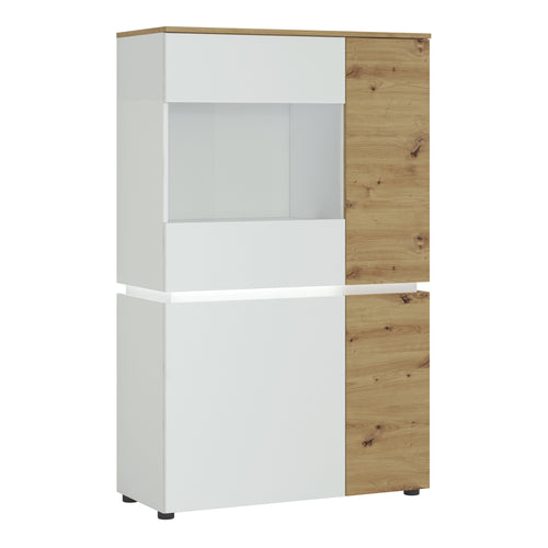 The simplicity of the piece and combination of trendy colours adds timeless style to the Luci collection. This modern vitrine features eight compartments, which are perfect for storage. The vitrine has an ergonomic handleless solution, soft-close accessories and tempered glass – this combination gives you convenience and safety. The Luci collection features integrated lighting (included), which makes it look unique; you can additionally illuminate the inside of the vitrine by purchasing optional lighting (sold separately). The piece is made of laminated chipboard that's resistant to damage, scratching, moisture and high temperatures. The Luci collection is available in two colours: Artisan Oak/Alpine White and Artisan Oak/Grey Cosmos.