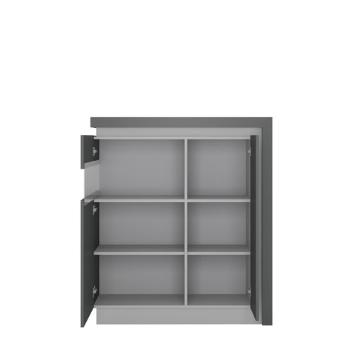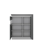 2 door designer cabinet (LH) (including LED lighting) in Platinum/Light Grey Gloss. Compact 2 door 123cm high display cabinet (left hand door opening) has smoky glazed area to display family treasures. Includes concealed lighting arrangement. A high quality collection in a ultra modern design - with each item complementing each other.