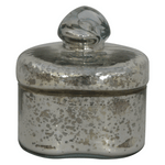 This beautiful little silver glass jar has a decorative metal lid with a battered effect. Its shape reflects the light from different angles and will make a great addition to your antique silver glass collection in any part of the home. It can be used to store little bits and pieces like jewelry, sweets, or coins and will also make a lovely gift for friends and family.