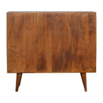 This chest of drawers has been hand crafted from 100% solid mango wood in a chestnut finish. It features nordic style legs with 3 large drawers which feature shiny candle knobs. This piece offers 1 subtle tile hand carved drawer front which will create a modern look in your home and can be paired nicely with the rest of the collection.