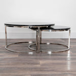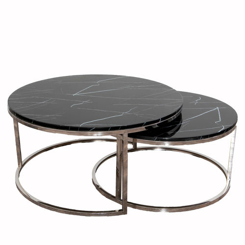 This modern nest of 2 coffee tables makes a striking addition to any home. It's sintered stone top with a modern finish is utterly stunning. The sophisticated nest of 2 Coffee Tables has a silver plated frame that captures the view of your décor and reflects back for added light.