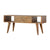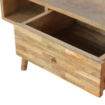 This coffee table offers a contemporary and versatile style of furniture for today's modern interiors. It has been constructed from 100% solid mango wood in an oak-ish finish and finished with a clear lacquer making the product durable and able to withstand years of use. It has a mixed pattern on the drawer front using different bits of wood and a candle knobs for easy access. It also has 2 open slots for extra storage making it a perfect piece for the living room.