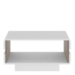 Small Designer Coffee Table in white with an Truffle Oak Trim. Unconventional design - a proposal for the followers of the latest trends. The clever mix of scratch resistant white melamine with beautiful high gloss on the sides of the coffee table and oak melamine trim makes this top quality collection of furniture the ideal destination for the most modern of homes, the massive range that includes many cabinets and wall units fulfils every storage and display option.