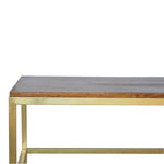 This rectangular coffee table has a refined shape and is topped by a lovely smooth chestnut finish. The perfect way to show off an industrial style design, this modern coffee table fits into any type of interior. The top is constructed from 100% solid mango wood and the base/legs are made from 100% metal which is finished in a beautiful brass gold.