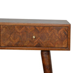 This piece offers a contemporary and versatile style of furniture for today's modern interiors. It has been constructed from 100% solid mango wood in an oak-ish finish and finished with a clear lacquer making the product durable and able to withstand years of use. It has an assorted pattern on the drawer fronts using different bits of wood and 2 candle knobs along with 2 open slots for extra storage. The perfect piece for your living room or hallway.