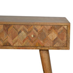 This console table offers a contemporary and versatile style of furniture for today's modern interiors. It has been constructed from 100% solid mango wood in an oak-ish finish and finished with a clear lacquer making the product durable and able to withstand years of use. It has an assorted pattern on the drawer fronts using different bits of wood and 2 candle knobs along with 2 drawers for extra storage. The perfect piece for your living room or hallway.