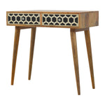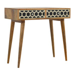 Simple, elegant, country-style charm is what this practical console table will provide. Constructed from 100% solid mango wood in a Oak ish finish, this unit has been built with sustainably sourced timbers and has two drawers with bone inlay fronts to help you keep your home organized. The bone inlay is sourced responsibly from deceased animals such as camels, goats, and buffaloes.