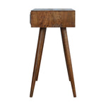This solid wood console table has been constructed from 100% solid mango wood and finished in a chestnut finish, it provides ample space on top for any lamps, plants, or photo frames. The main feature of the piece is the hand-carved raised prism design on the drawer front, it also includes 1 plain drawer which can be used for storing any smalls bits and pieces. It is the perfect piece for the hallway and will fit nicely into your home, with its clean design to suit most interiors.