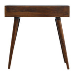 Inspired by a vintage design, this solid wood console table provides ample space. It is constructed from 100% solid mango wood and has a fine chestnut finish. Other features a decent-sized table top and 2 drawers with gold brass which provide discreet storage. The perfect addition to any home or office environment.