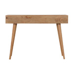 This console table has been constructed from 100% solid mango wood in an oak-ish finish. It has 3 Wood Resin Inlay drawers for storage convenience and features Nordic style legs...