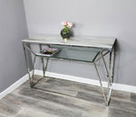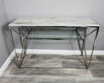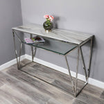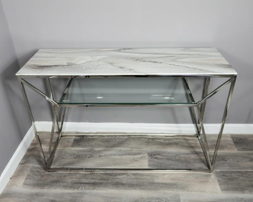 Beautiful stainless steel console table with marble glass top and clear glass shelf. Marble glass is a premium glass printed throughout layers. The glass does not stain easy like stone Marble, it's easily wipeable and will retain it's look.
