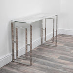 This Marble Glass Console Table is sure to be a focal point in any home, it's stainless steel legs are silver plated and create a stunning mirrored effect. The top is made from marble glass, which is more durable than stone marble.