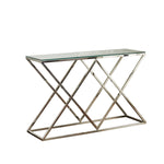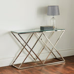 Beautiful pyramid frame console table with a thick tempered glass top. The table has a silver plated stainless frame which gives a quality finish.