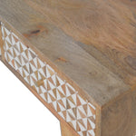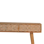 As part of our Sarina Range, this console table has been constructed from 100% solid mango wood in an oak-ish finish. It has 3 White Resin Inlay drawers for storage convenience and features Nordic style legs with shiny knobs which give a lovely contrast against the print. More items are available from the Sarina range.