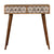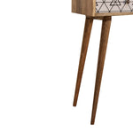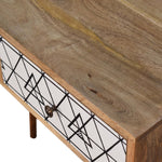 This 2 drawer console table has been constructed from 100% solid mango wood and finished in a fine oak-ish finish body. The main feature of this piece are the screen-printed drawer fronts which have a beautiful black and white geometric design giving the piece extra dimension and character. It also has 4 Nordic-style legs and ample space on top for a plant, photo frames, or ornaments.