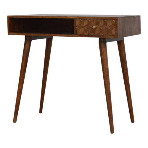The main feature of this writing desk is the hand carved cube drawer front which makes the pieces from this collection stand out. It has been constructed from 100% solid mango wood in a chestnut finish, features 1 open slot for extra storage, and stands on 4 Nordic style legs. It can be partnered with the other pieces from the range or stand individually as its style is versatile and can fit into different types of interiors.