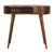 This solid wood writing desk has been constructed from 100% solid mango wood in a chestnut finish and offers a unique shaped design with rounded edges. It features one small drawer with a shiny knob, open slot, and Nordic-style legs. A great simple and add to the home.