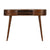 This solid wood writing desk has been constructed from 100% solid mango wood in a chestnut finish and offers a unique shaped design with rounded edges. It features one open slot and 2 mini drawers which have shiny knobs and Nordic style legs. A great simple and add to the home.