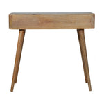 Constructed from 100% solid mango wood in an oak-ish finish, this writing desk features both a open slot and a drawer suitable for working and studying from home. It has a sleek compact design with nordic style legs and a shiny knob along with a leaf embossed resin design on top.