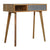 This divine writing desk has been constructed from 100% solid mango wood with an oak-ish finish body and has a grey hand painted, hand carved drawer front which has a candle knob for easy access to and from the drawers. The modern and simple piece would compliment any living room or bedroom and is ideal for compact city homes.