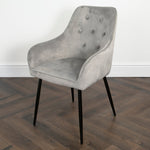 This timeless design is sure to look gorgeous by any dining table, the neutral shade of grey keeps it looking elegant. Finished with a button back and black tapered legs....