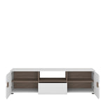 Wide TV unit in white with an Truffle Oak trim. Unconventional design - a proposal for the followers of the latest trends. The clever mix of scratch resistant white melamine with beautiful high gloss fronts and oak melamine trim makes this top quality collection of furniture the ideal destination for the most modern of homes, the massive range that includes many cabinets and wall units fulfils every storage and display option.