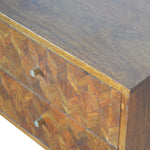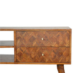 This piece offers a contemporary and versatile style of furniture for today's modern interiors. It has been constructed from 100% solid mango wood in a chestnut finish and finished with a clear lacquer making the product durable and able to withstand years of use. It has an assorted pattern on the drawer fronts using different bits of wood and 2 candle knobs along with 2 open slots for extra storage. The perfect piece for the home which can be used alone or with other pieces from the collection.