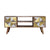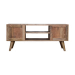 Providing an elegant touch to a living room, this 100% solid mango wood cabinet has an oak-ish finish and has been given a clear lacquer for extra durability, it features drawers that have a combination of mango wood, a real brass sheet, and acrylic (faux) marble, the 2 open shelves and drawers will hold anything such as spare cables, gaming handsets, and other techy bits and bobs. Other features include shiny brass knobs and nordic style legs.